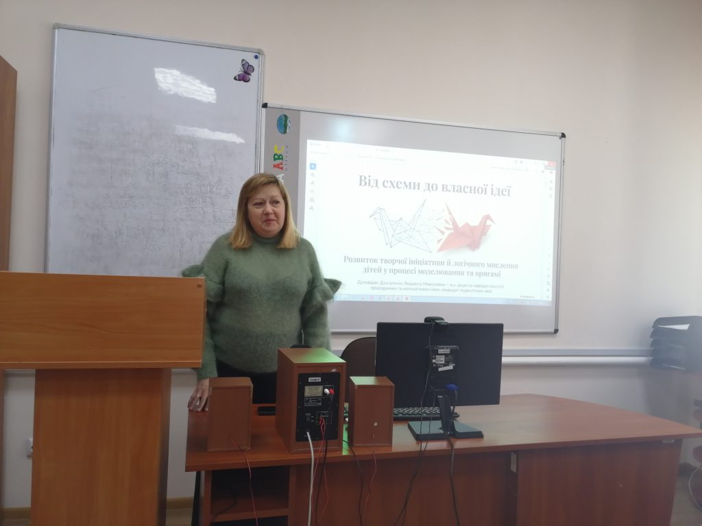 З темою  «Від схеми до власної ідеї: розвиток творчої ініціативи й логічного мислення дітей у процесі моделювання та оригамі» перед присутніми виступила Людмила Миколаївна Дзигаленко, в.о. доцента кафедри екології, природничих наук КЗВО «ВАБО», кандидат педагогічних наук.